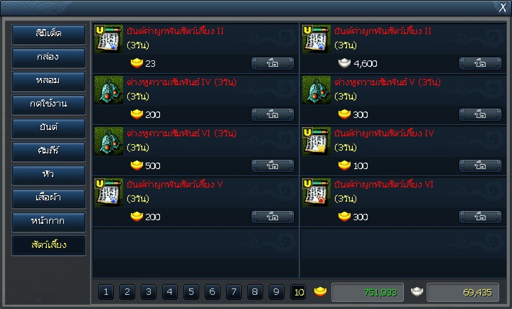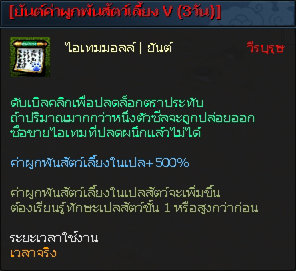 - เพิ่มไอเท็ม "ยันต์เพิ่มค่าผูกพันสัตว์เลี้ยง IV+300% (3วัน), ยันต์เพิ่มค่าผูกพันสัตว์เลี้ยง V+500% (3วัน), ยันต์เพิ่มค่าผูกพันสัตว์เลี้ยง VI+700% (3วัน)"