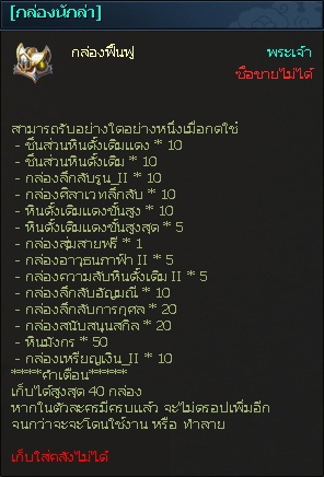 - นำดันเจี้ยนแผนที่ 'นันจู' ออกจากระบบ โดยทำการย้ายรายการไอเท็มดรอปทั้งหมด ไปไว้แผนที่ 'ที่ราบตรงกลาง' ไอเท็มชื่อ "กล่องนักล่า"